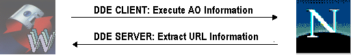 The first step is to gain access to the NETSCAPE's OLE Automation object (the Netscape.Network.1 Automation Object to be more specific [1]). Using this object, SOUR will be able to access network data through the same mechanisms NETSCAPE uses. However, NETSCAPE's OLE AUTOMATION does not provide the functionality necessary to manipulate the NETSCAPE NAVIGATOR user interface. This is possible only by using the DDE protocol which will make SOUR to act simultaneously like a NETSCAPE client and server, as illustrated in figure 5.